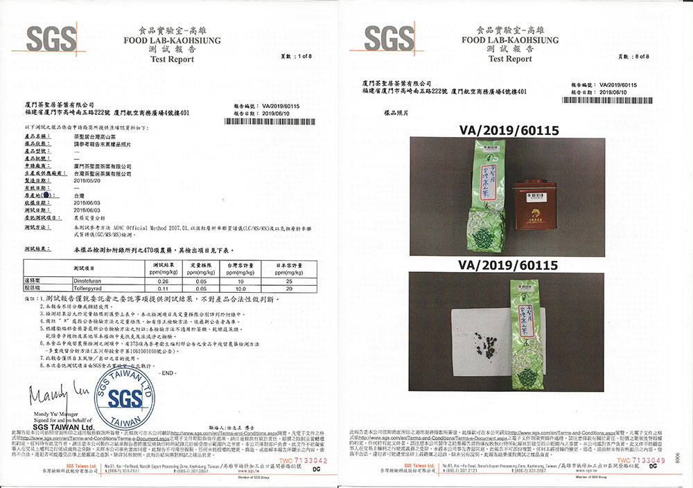 - 阶段特征:将成品茶送至台湾SGS检测机构进行426项无农残检测,台湾SGS检测机构检测合格后再送至大陆SGS检测机构进行检测。
